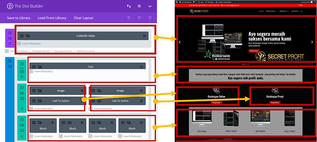 Pada bagian kiri (Bulider Temptate Divi) yang sudah kami beri kotak merah dan panah yang mengarah ke halaman utama website (Home) itu untuk mempermudah edit Pages Builder Divi Theme teks dan gambar.