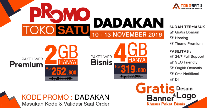 Dear All, Toko Satu Menghadirkan Promo Dadakan Sepsial Minggu ini diskon hingga 70% dari harga website. Segera! Promo Tak Terduga dan Dadakan ini berlaku terbatas Minggu ini. Promo dimulai pada Kamis 10- 13 November 2016 .