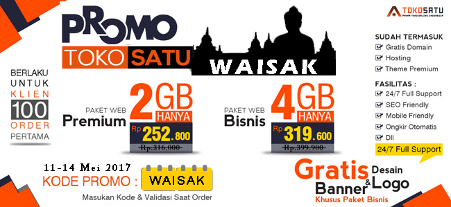 Dear All, Jasa Pembuatan Website No.1 Terpopuler di Indonesia dengan Harga Murah Berkualitas hanya di Toko Satu (www.tokosatu.com) yang telah dipercaya ribuan klien tokosatu.com, saat ini kembali menghadirkan Promo Hari WAISAK mulai pada tanggal 11 – 14 Mei 2017.