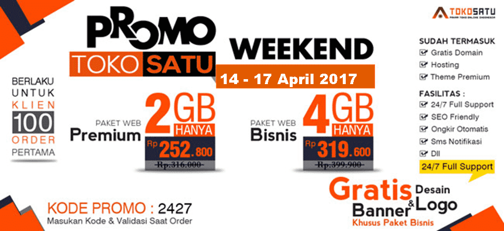 Dear All, Jasa Pembuatan Website No.1 Murah dan Terpopuler di Indonesia Toko Satu (www.tokosatu.com) yang telah dipercaya Ribuan klien tokosatu.com, saat ini Menghadirkan Promo Weekend mulai pada tanggal 14 – 17 April 2017.