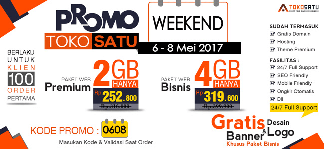 Dear All, Jasa Pembuatan Website No.1 Terpopuler di Indonesia dengan Harga Murah Berkualitas hanya di Toko Satu (www.tokosatu.com) yang telah dipercaya ribuan klien tokosatu.com, saat ini kembali menghadirkan Promo Akhir Pekan mulai pada tanggal 06 – 08 Mei 2017.