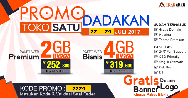 Hai, Apa Kabar ? Ketemu lagi ni di Jasa Pembuatan Website # 1 Terpopuler di Indonesia, Profesional, Harga Murah Kualitas Terjamin hanya di Toko Satu. Telah dipercaya ribuan klien tokosatu.com, saat ini kembali menghadirkan Promo Dadakan mulai pada tanggal 22 – 24 Juli 2017.