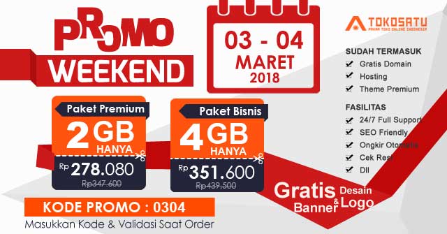 Hallo, Apa Kabar ? Ketemu lagi di Jasa Pembuatan Website #1 Terpopuler di Indonesia, Profesional, Harga Murah, Kualitas Terjamin hanya di Toko Satu. Telah dipercaya ribuan klien, silakan lihat portofolio tokosatu.com saat ini kembali menghadirkan Promo Weekend mulai pada tanggal 03-04 Maret 2018.