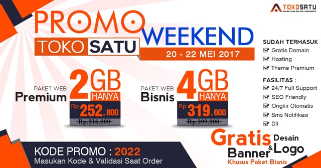 Hai, Apa Kabar ? Ketemu lagi ni di Jasa Pembuatan Website Nomor 1 Terpopuler di Indonesia Profesional, Harga Murah Berkualitas Terjamin hanya di Toko Satu (www.tokosatu.com). Telah dipercaya ribuan klien tokosatu.com, saat ini kembali menghadirkan Promo Weekend mulai pada tanggal 20 – 22 Mei 2017.