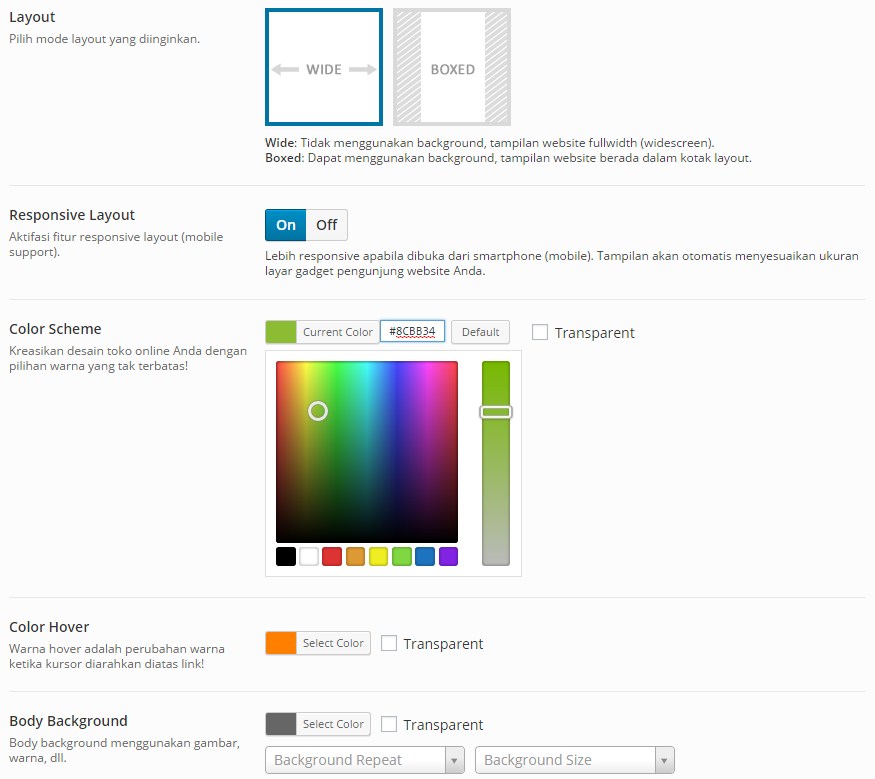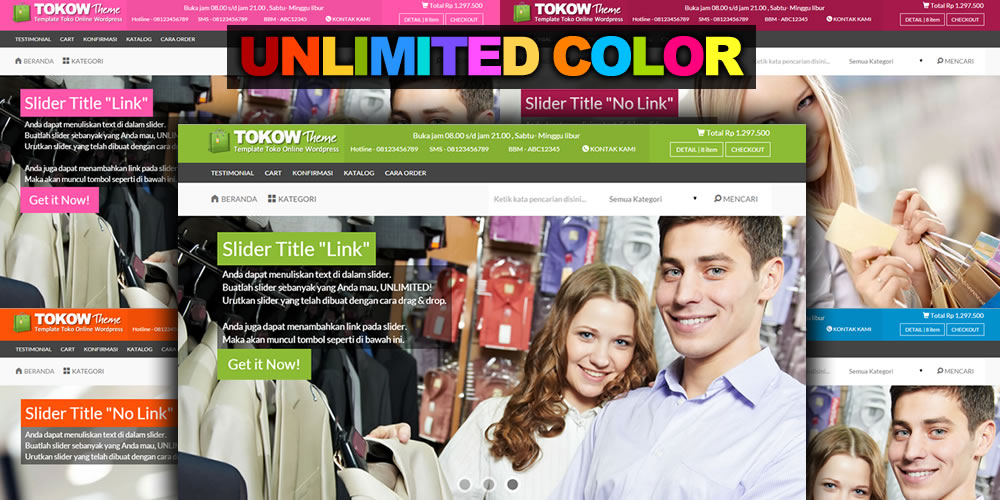 Kreasikan tampilan website toko online Anda sesuai dengan selera Anda. Anda dapat mengganti warna dasar template ini dengan warna apa saja dari theme options yang telah disediakan.